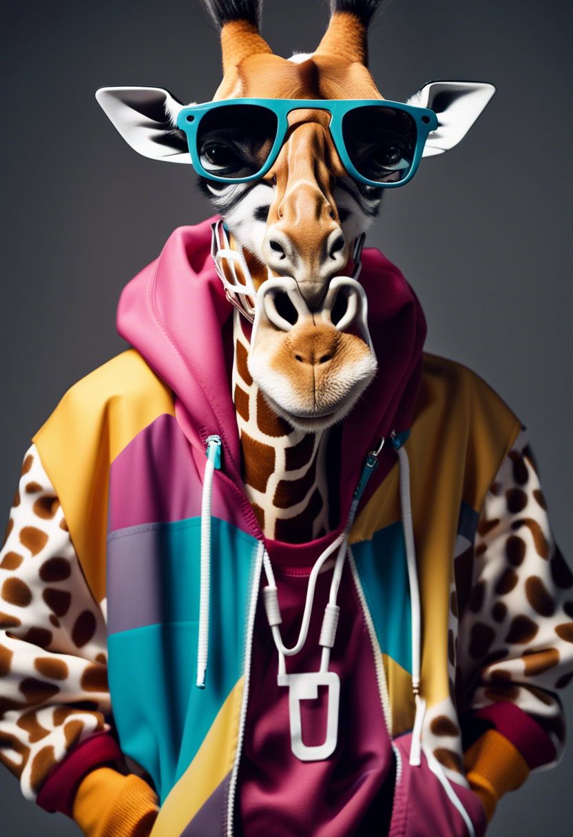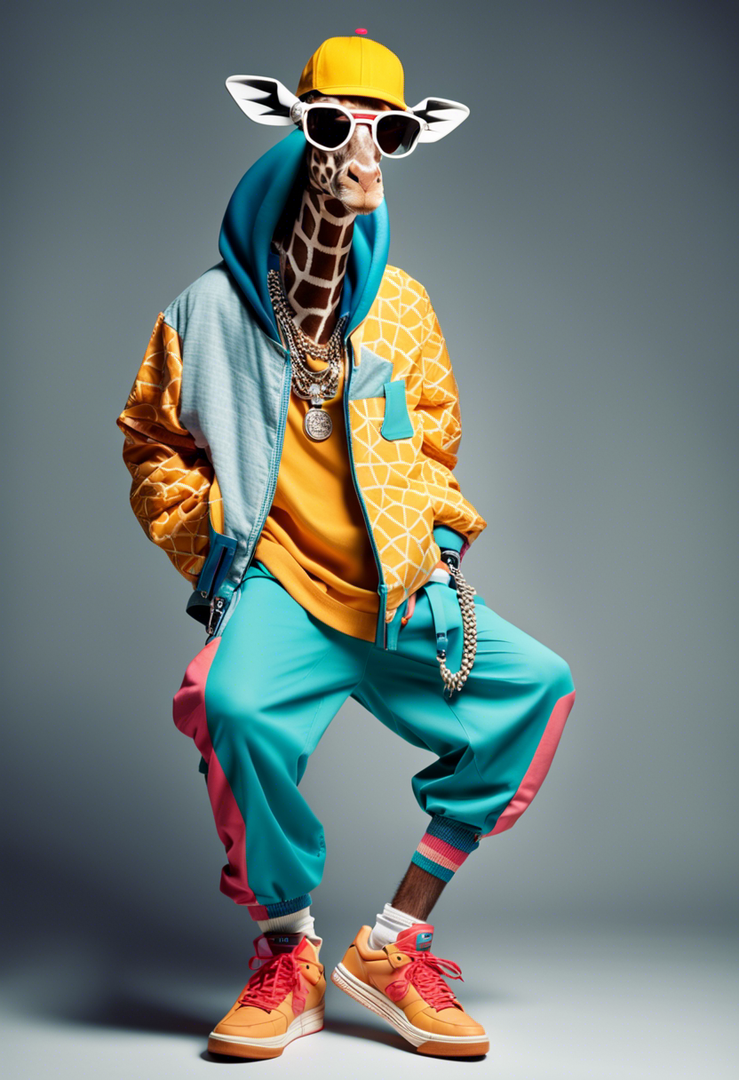 Fashion photography of a anthropomorphic giraffe dressed in large hiphop clothes from 1980s , wearing sneakers , Sony Alpha α7, ISO1900, volumetric lighting,